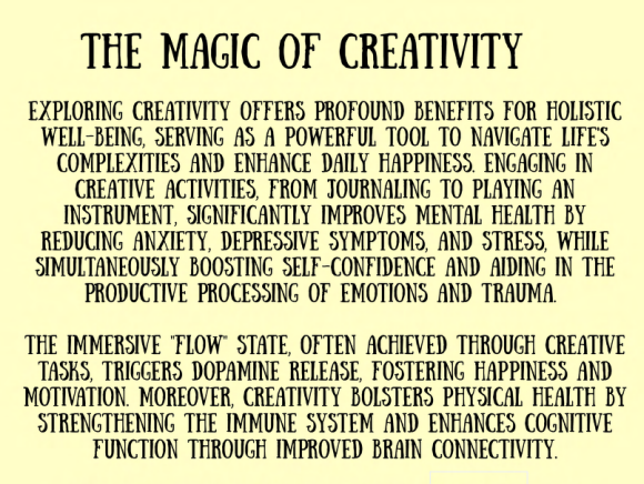 We really enjoyed reading their newsletter, which has many great excerpts like the one below "THE MAGIC OF CREATIVITY" that highlights how creative expression supports mental and physical well-being. |
