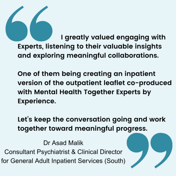 Recently, several Experts from Mental Health Together attended the Derbyshire Healthcare Medical Senate (large meeting for all psychiatrists in Derby and Derbyshire). Experts received feedback from the Medical Director and other senior clinicians, who valued the session and have given the go ahead on a new patient information leaflet co-produced with Mental Health Together.